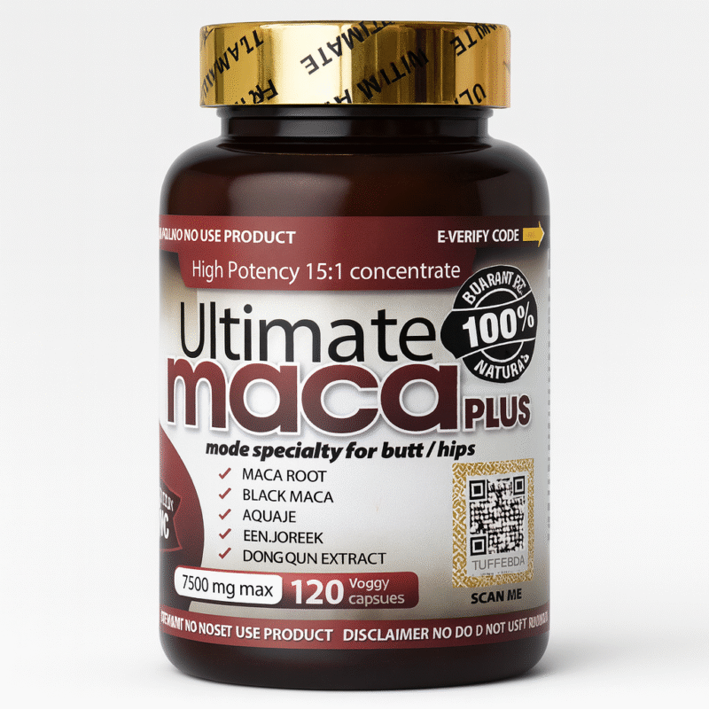 Boost your curves naturally with Ultimate Maca Plus – a high-potency herbal supplement made with Maca Root, Black Maca, Aguaje, Fenugreek, Tribulus, and Dong Quai Extract. Specially formulated to support fuller hips and butt, enhance energy, and promote overall vitality. 100% natural, high concentration 15:1 formula with 7500 mg max strength in 120 veggie capsules.